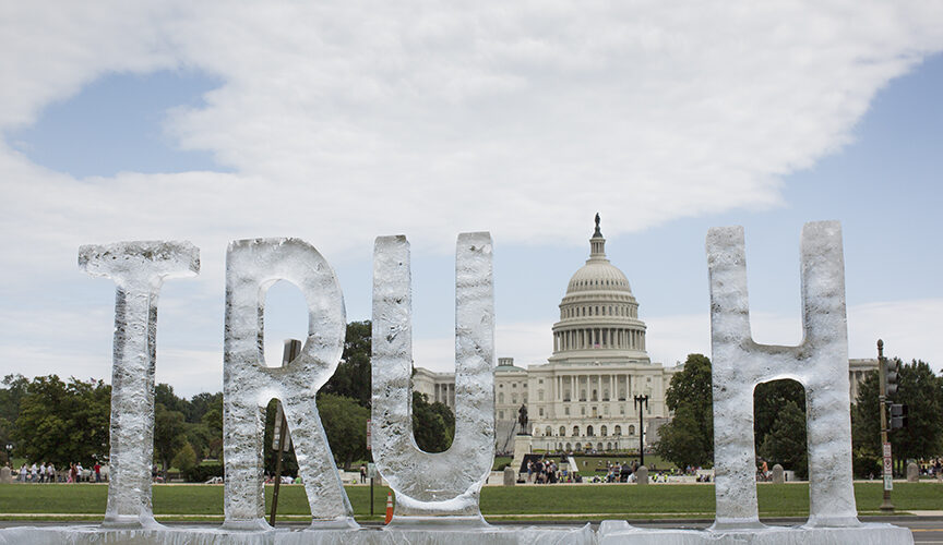 On October 15, 2025, Nora and Marshall are returning to the National Mall in Washington, D.C., to install their latest temporary monument of Democracy. The installation measures 17 ft x 5 feet high and weighs over 3,000 pounds. The word carved in ice will melt away and disappear over 10-12 hours. The event launches at 12 Noon with a press conference featuring the artists, Rev. William H. Lamar IV, Tariq Habash, Senator Nina Turner and Rob Weisman.